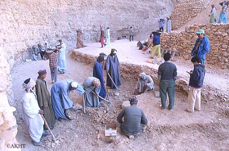 ルクソール西岸に位置するクルナ村は、新王国時代の岩窟墳墓群が建造されている村で、その墓は村人の住居にもなっている。「魚の丘」との比較研究を目的として、1980年12月から調査は始まった。84年には317号墓から200体にものぼるミイラが発見され、また、86年12月に始まったドゥラ・アブー・アル=ナガ地区の調査では、W4号墓(早稲田隊が発見した墓には「W」の頭文字がつく)から色彩が残る男性彫像や石柱などが発見されている